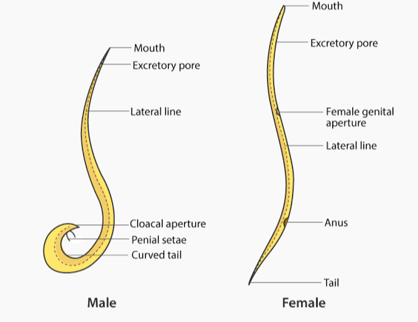 Male: Smaller (15–30 cm), posterior end curved ventrally with copulatory spicules